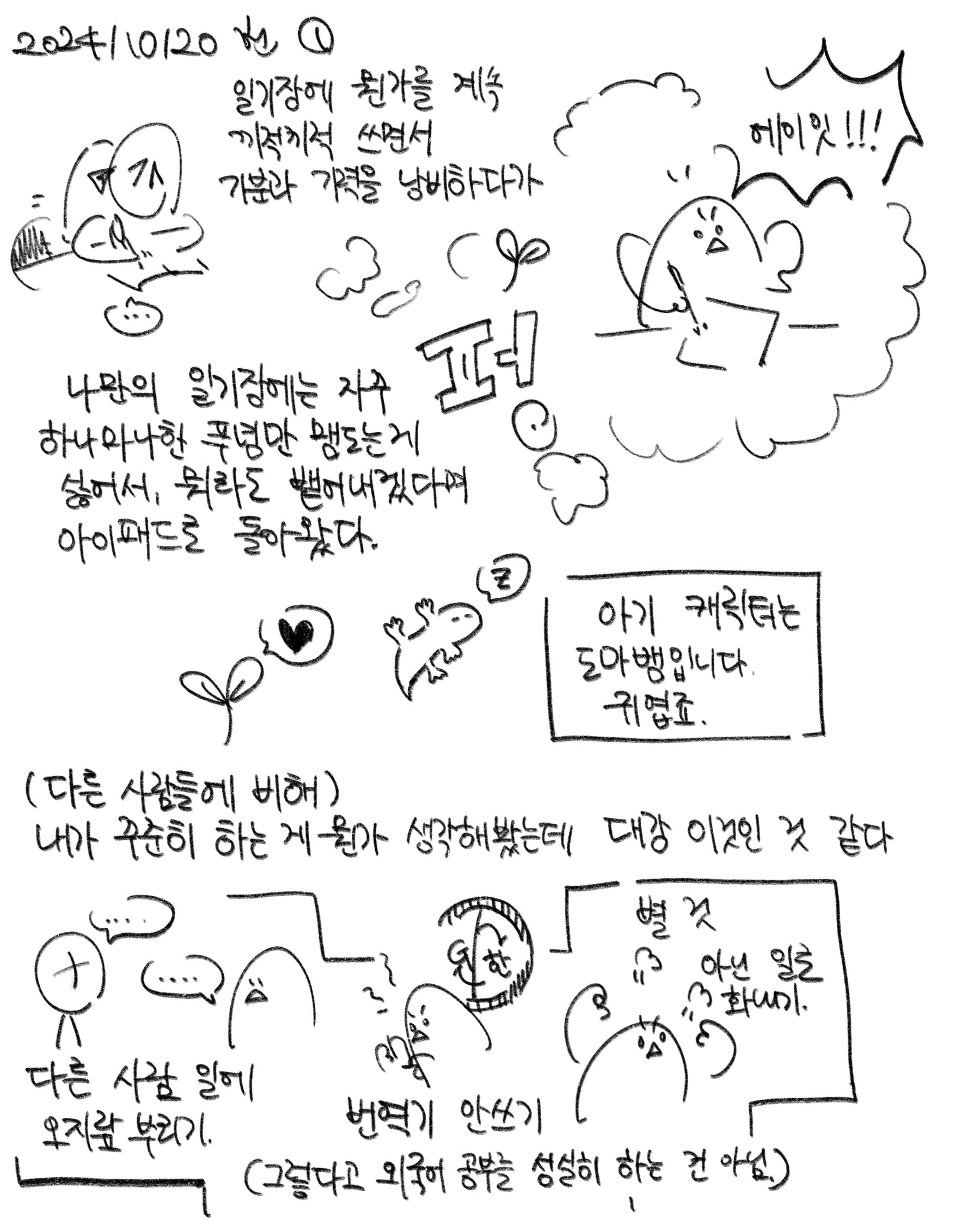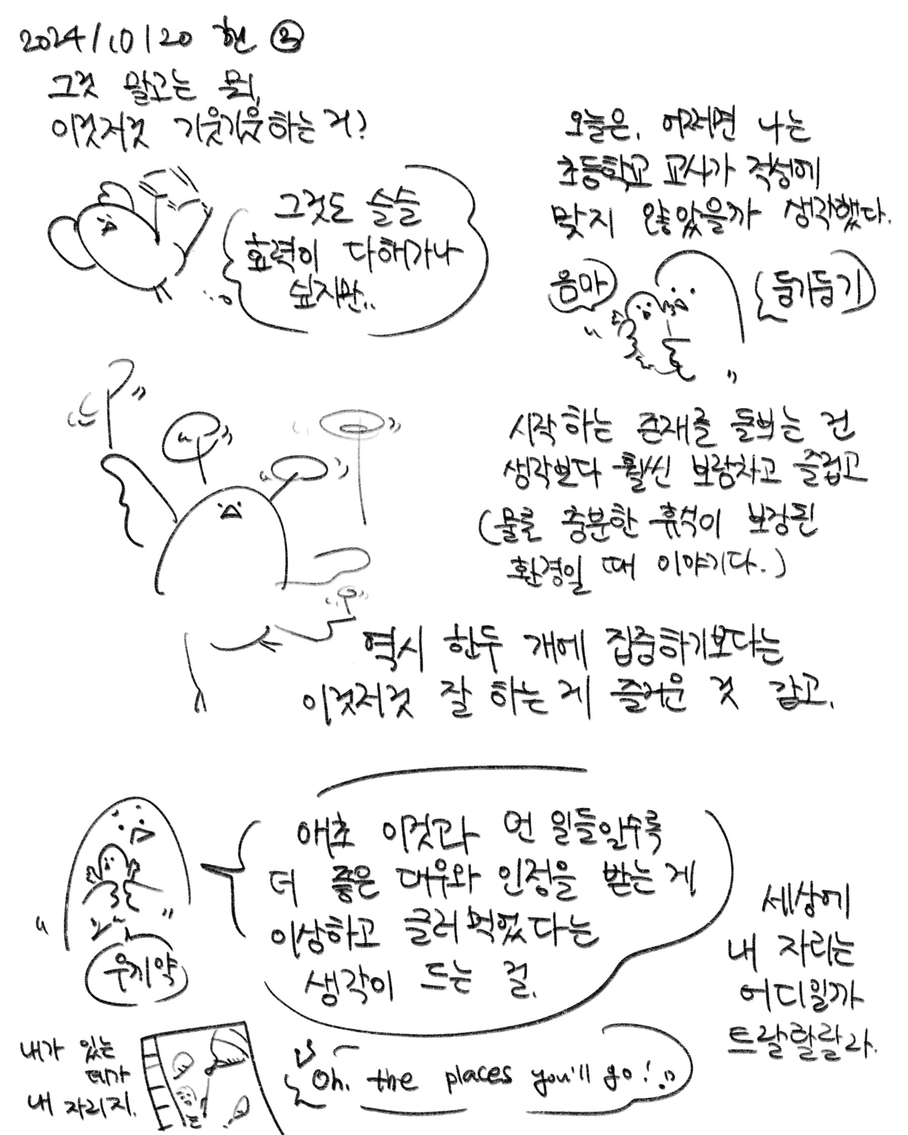 그래서 오늘의 나는 아기를 돌봤고, 중고로 산 낡은 의자를 리폼하는 과정에 참여했고, 펜으로 약간 울적한 기분을 일기장에 끄적이다가 이럴 바에는 보는 사람이 있는 데에 올리자며 아이패드로 돌렸고, 부동산이랑 실랑이 하던 걸 일단 매듭지었고 넷플릭스에서 흑백요리사를 쭈욱 봤다. 한국계 미국인인 에드워드 리가 비빔밥(?)을 내면서 "나는 비빔 인간입니다."라고 말한 걸 보며 울컥했다. 너무 오래 밖에 있었나 보다. 나는 비빔 인간은 아니고.. 김밥 인간? 아무튼 비빔 인간들 화이팅.